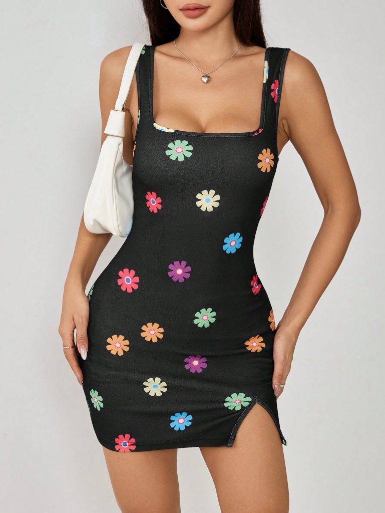 SHEIN PETITE Women's Black Colorful Floral Romantic Casual Holiday Backless Dress, Dress