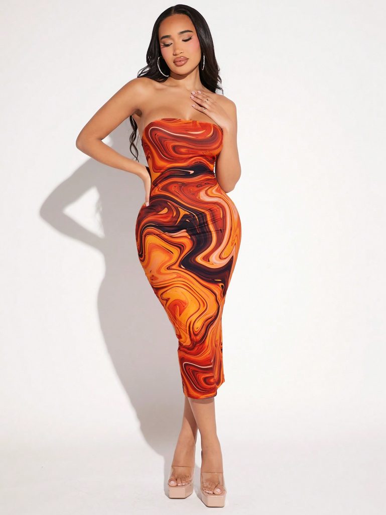 SHEIN SXY Plus Size Casual Minimalist Valentine’s Day Full Print Bandeau Dress, Summer